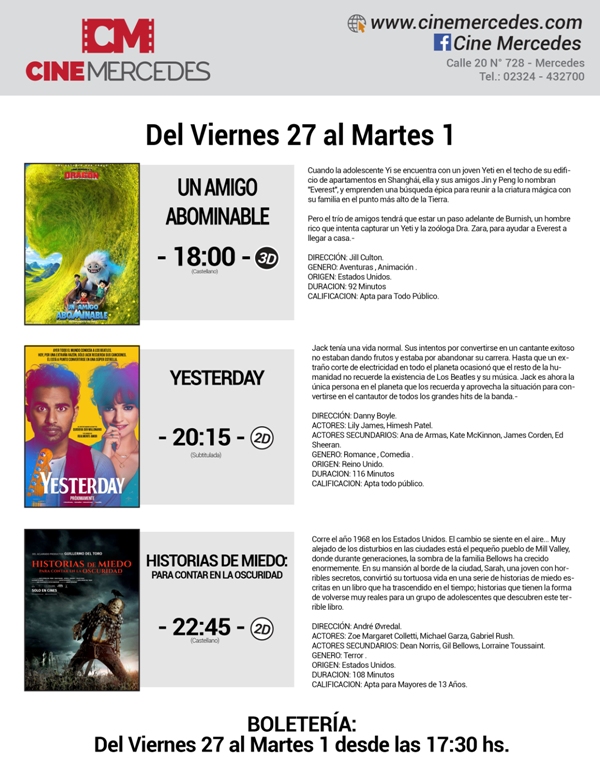 Desde el viernes, el Cine Mercedes proyecta tres películas. Infantil, terror y musical son las propuestas hasta el 1 de octubre. Un Amigo Abominable (18 horas. en 3D), «Yesterday» (20:15 hs) e «Historias de Miedo: Para contar en la oscuridad» (22:45 hs) son las propuestas de la cartelera local.
