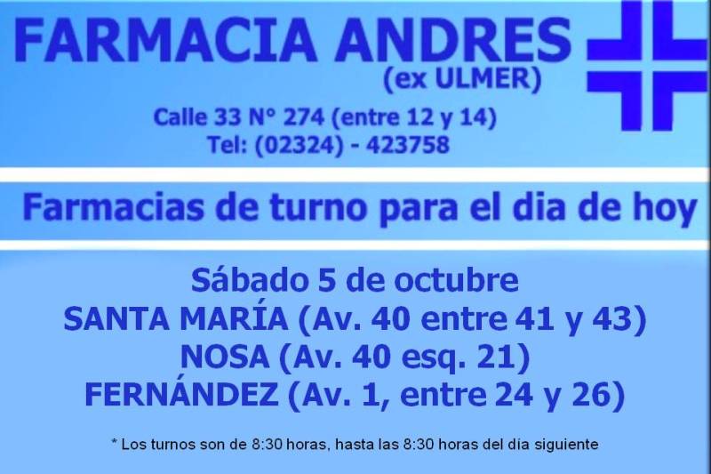 Farmacias de turno día sábado 5 de octubre 5 octubre, 20195 octubre, 2019Comparte esto: Haz clic para compartir en WhatsApp (Se abre en una ventana nueva) WhatsApp Haz clic para compartir en Telegram (Se abre en una ventana nueva) Telegram Haz clic para compartir en X (Se abre en una ventana nueva) X Haz clic para compartir en Facebook (Se abre en una ventana nueva) Facebook TE PUEDE INTERESARCOMENTARIOS Comentarios