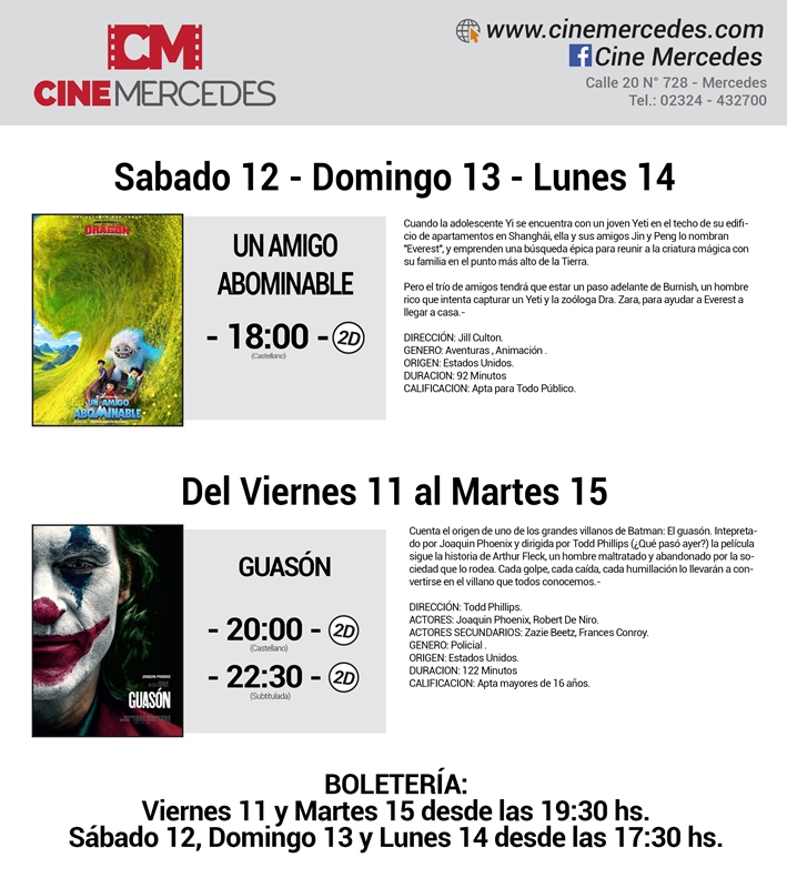 El Cine Mercedes, entre el viernes 11 y el martes 15 de octubre continúa presentando el film recientemente estrenado, Guasón (20 y 22:30 horas) y Un Amigo Abominable (18 horas, sábado, domingo y lunes)