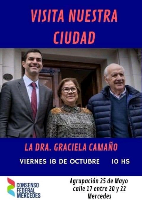 Promediando la mañana de este viernes 18 de octubre, la diputada nacional Graciela Camaño, quien se candidatea a renovar su banca en la lista de Consenso Federal, estará presente en Mercedes.