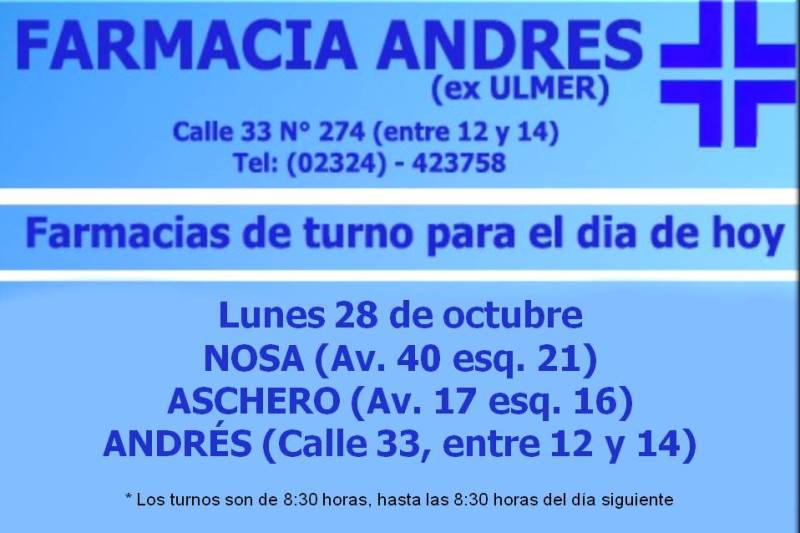 Farmacias de turno día lunes 28 de octubre 28 octubre, 2019Desde hoy a las 8:30 y hasta mañana la misma hora, las farmacias de turno son: NOSA, ASCHERO y ANDRÉSComparte esto: Haz clic para compartir en WhatsApp (Se abre en una ventana nueva) WhatsApp Haz clic para compartir en Telegram (Se abre en una ventana nueva) Telegram Haz clic para compartir en X (Se abre en una ventana nueva) X Haz clic para compartir en Facebook (Se abre en una ventana nueva) Facebook TE PUEDE INTERESARCOMENTARIOS Comentarios