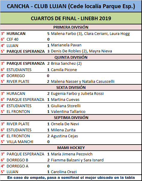 Con Parque Esperanza como organizador, pero en cancha del Club Luján, se jugaron los cuartos de final del torneo de hockey de la LINEBH, donde Estudiantes y CEF 40 jugaron partidos para clasificar a semifinales, donde Ateneo ya espera en Primera, Sexta y Mami.