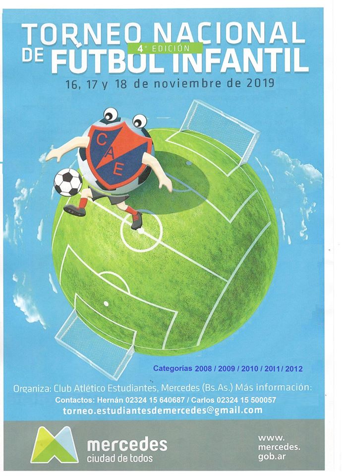 Nuevamente bajo la organización del Club Estudiantes, este fin de semana largo se llevará adelante la cuarta edición del Torneo Nacional de Futbol Infantil Copa Ciudad de Mercedes. Además del local, estarán participando los mercedinos Vélez, Palometas, Ateneo de la Juventud, Defensores Juniors, Club Mercedes, Mercedes A, El Frontón, Quilmes y Unión.