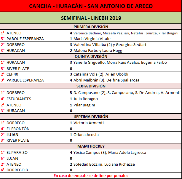 En cancha de Huracán de San Antonio de Areco se jugaron las semifinales de la Liga del Noroeste Bonaerense de Hockey. Ateneo, CEF 40 y Estudiantes peleaban en las diferentes categorías por jugar la final, pero solo las albicelestes lograron el cometido en Primera, Sexta y Mami, quedando la Quinta del verdiblanco y la Sexta del Pincha, peleando el tercer puesto. Todo se definirá este sábado (domingo si es que llueve) en cancha de Dorrego de Navarro.