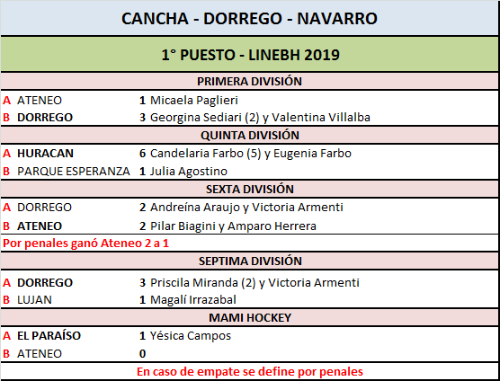 Luego, no hubo buenos resultados para los conjuntos mercedinos, ya que Ateneo perdió la final de Primera División ante Dorrego por 3 a 1, marcando Micaela Paglieri. También fue derrota en Mami para las chicas de la Liga de Padres de Familia, que perdieron 1 a 0 ante El Paraíso.