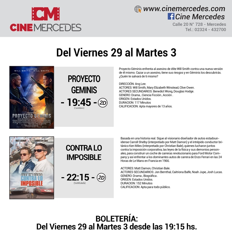 Del viernes 29 de noviembre al martes 3 de diciembre, dos películas que unan la acción, el suspenso, la ficción por un lado, y el drama y hechos reales por el otro estarán en la pantalla del Cine Mercedes. En la función de 19:45 horas, el director Ang Lee con Will Smith encabezando el elenco llega con «Proyecto Géminis». En tanto, a las 22:15 serán las funciones de «Contra Lo Imposible» («Ford vs. Ferrari») con Matt Damon y Christian Bale en los personajes principales de una historia basada en hechos reales en la carrera Le Mans de 1966.