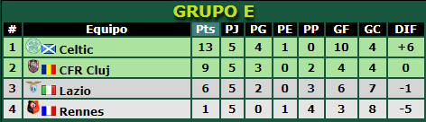 Respecto al equipo visitante, el CFR Cluj venció en sus dos últimos partidos de la competición contra el Stade Rennes en su feudo y el Stade Rennes fuera de casa, por 1-0 y 0-1 respectivamente. Con esta derrota el CFR Cluj se situó en segunda posición al finalizar el partido, mientras que la Lazio Roma es tercera.