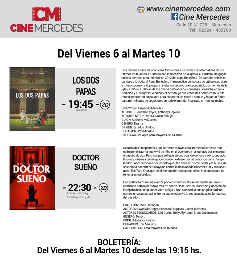 Dos películas se presentarán entre el viernes 6 y el martes 10 de diciembre en el Cine Mercedes. Basada en hechos reales, «Los Dos Papas» (19:45 horas) es la historia íntima del encuentro entre el Papa Benedicto y el, por entonces, Cardenal Jorge Bergoglio. También podrá verse la historia de terror basada en los libros de Stephen King, «Doctor Sueño». Secuela de El Resplandor, las funciones son a la hora 22:30.