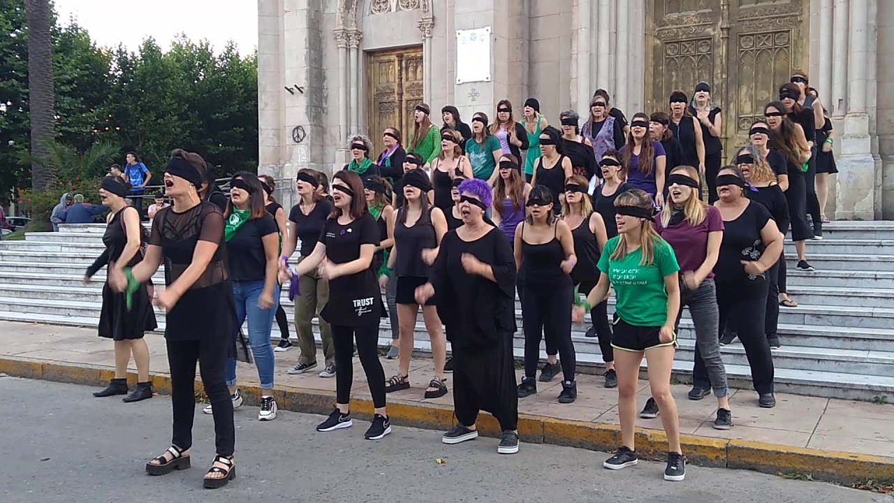 Tras un ensayo, se acomodaron en hileras en el atrio de la Catedral y con los ojos vendados hicieron dos representaciones del himno contra la violencia hacia la mujer que repite en su estribillo «El Violador eres Tu» y marca la complicidad de la Policía, la Iglesia, los Jueces y el Estado ante el maltrato a las mujeres y los femicidios.