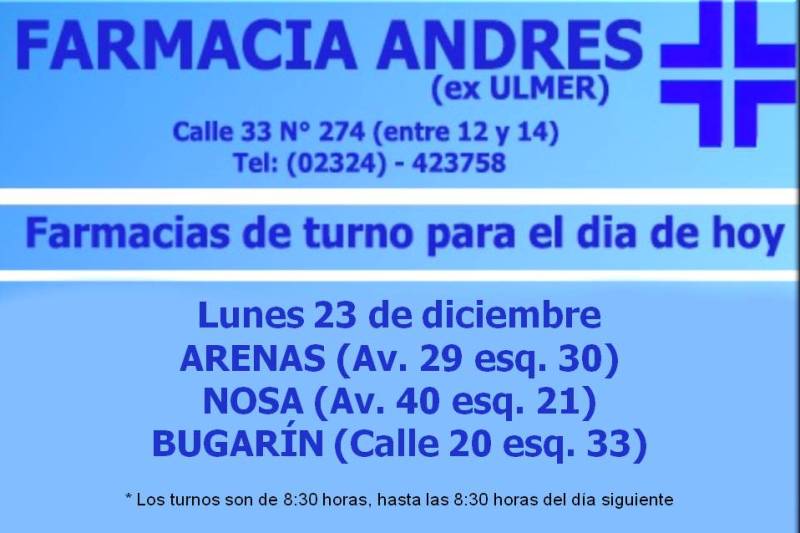 Farmacias de turno día lunes 23 de diciembre 26 diciembre, 201923 diciembre, 2019Desde la hora 8:30 del día de hoy y hasta mañana a la misma hora, las farmacias de turno son: Arenas, Nosa y BugarínComparte esto: Haz clic para compartir en WhatsApp (Se abre en una ventana nueva) WhatsApp Haz clic para compartir en Telegram (Se abre en una ventana nueva) Telegram Haz clic para compartir en X (Se abre en una ventana nueva) X Haz clic para compartir en Facebook (Se abre en una ventana nueva) Facebook TE PUEDE INTERESARCOMENTARIOS Comentarios