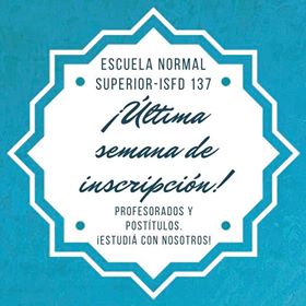 El Instituto Superior de Formación Docente N° 137 que funciona en la Escuela Normal inscribe hasta el viernes 27 de diciembre para cinco Profesorados y Postítulos. Retomará la inscripción en febrero cuando se reinicie la actividad educativa en todas las instituciones.