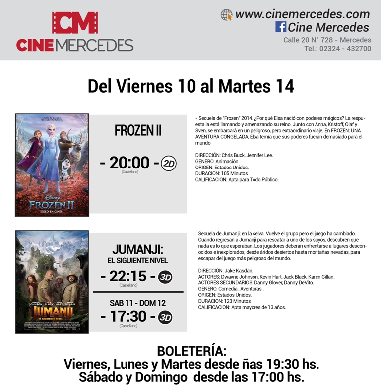 Desde el viernes 10 al martes 14 de enero, el Cine Mercedes presentará dos películas para toda la familia. En las funciones de la hora 20, continúa Frozen 2 con Elsa, Ana, Olaf, Kristoff y Sven. El estreno de la semana es la secuela de Jumanji. La película que protagoniza Dwayne Johnson se verá en las funciones de la hora 22:15 y el sábado 11 y domingo 12 la función es a la hora 17:30.