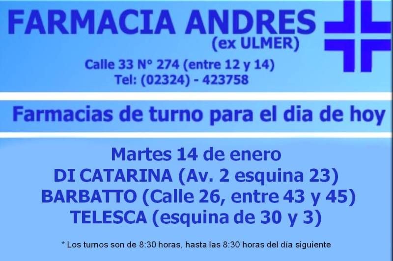 Farmacias de turno día martes 14 de enero 15 enero, 202014 enero, 2020Las farmacias de turno desde hoy 8:30 hasta mañana a la misma hora son: Dicatarina, Barbatto y TelescaComparte esto: Haz clic para compartir en WhatsApp (Se abre en una ventana nueva) WhatsApp Haz clic para compartir en Telegram (Se abre en una ventana nueva) Telegram Haz clic para compartir en X (Se abre en una ventana nueva) X Haz clic para compartir en Facebook (Se abre en una ventana nueva) Facebook TE PUEDE INTERESARCOMENTARIOS Comentarios