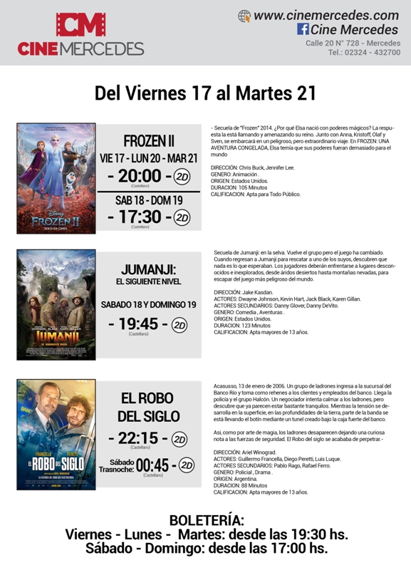 Desde este viernes 17 de enero, el Cine Mercedes proyectará tres películas en la gran pantalla local. El estreno de la semana es “El Robo del Siglo”, película argentina protagonizada por Guillermo Francella y Diego Peretti basada en la historia del robo a un banco de Acassuso. La película argentina se verá en las funciones de las 22:15 y el sábado trasnoche a 0:45 horas. Por otra parte, continúa “Frozen II” y “Jumanji: El Siguiente Nivel” ambas películas con horarios especiales los días sábado y domingo para que las familias puedan elegir las funciones.