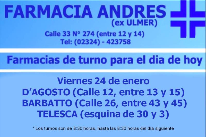 Desde las 8:30 horas del día de hoy y hasta la misma hora de mañana, las farmacias de turno son: D’Agosto, Barbatto y Telesca