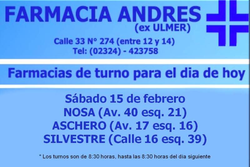 Farmacias de turno día sábado 15 de febrero 15 febrero, 2020Las farmacias de turno desde hoy 8:30 hasta mañana a la misma hora son: Nosa, Aschero y SilvestreComparte esto: Haz clic para compartir en WhatsApp (Se abre en una ventana nueva) WhatsApp Haz clic para compartir en Telegram (Se abre en una ventana nueva) Telegram Haz clic para compartir en X (Se abre en una ventana nueva) X Haz clic para compartir en Facebook (Se abre en una ventana nueva) Facebook TE PUEDE INTERESARCOMENTARIOS Comentarios
