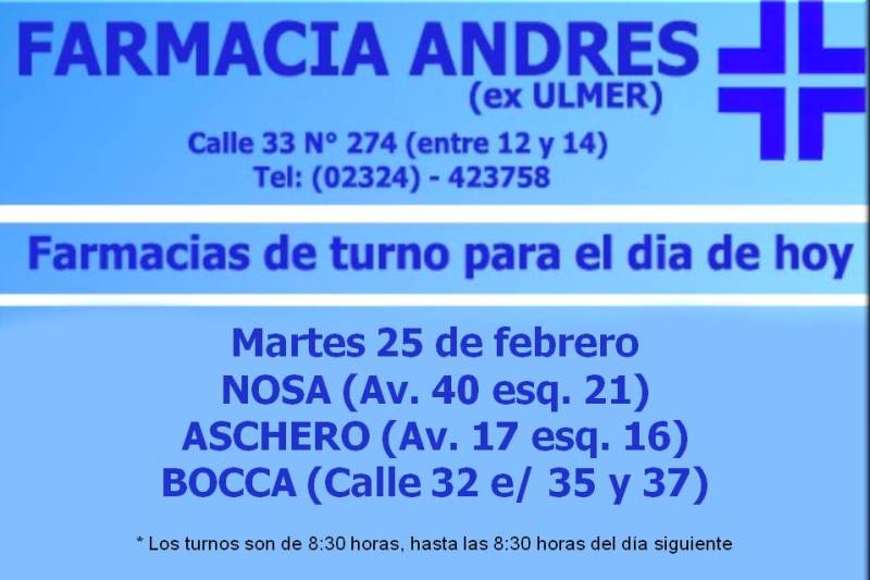 Farmacias de turno día martes 25 de febrero 25 febrero, 2020Las farmacias de turno desde hoy 8:30 hasta mañana a la misma hora son: Nosa, Aschero y BoccaComparte esto: Haz clic para compartir en WhatsApp (Se abre en una ventana nueva) WhatsApp Haz clic para compartir en Telegram (Se abre en una ventana nueva) Telegram Haz clic para compartir en X (Se abre en una ventana nueva) X Haz clic para compartir en Facebook (Se abre en una ventana nueva) Facebook TE PUEDE INTERESARCOMENTARIOS Comentarios