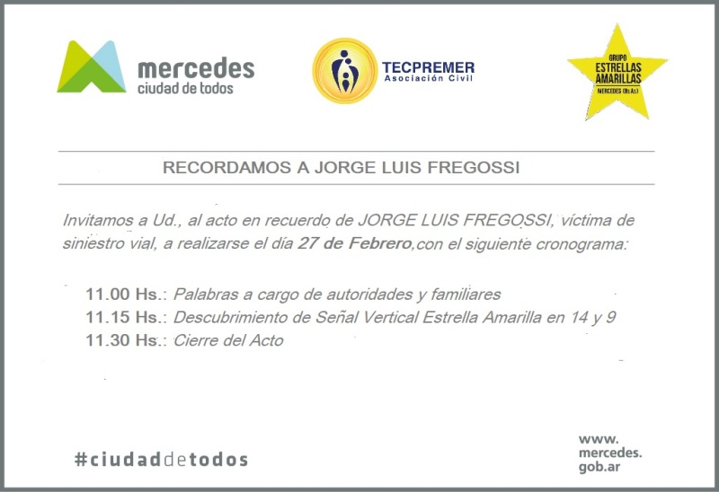 Este jueves 27 de febrero, los familiares de Jorge Luis Fregossi, al cumplirse un año de su fallecimiento tras sufrir un siniestro vial, colocarán una señal vertical en homenaje al jubilado. El acto será en la esquina de 14 y 9, a las hora 11.