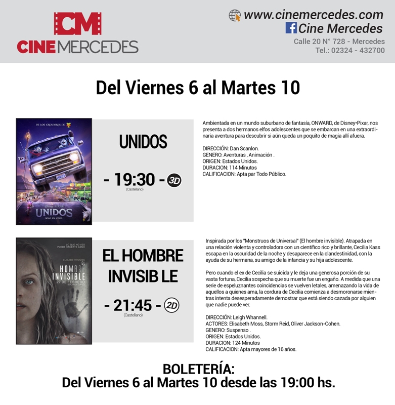 El Cine Mercedes estrenará dos películas en la pantalla local. Desde el viernes 6 y hasta el martes 10 de marzo, se presentarán dos películas de estreno. Para los más chicos, llega la película de animación «Unidos» en la función de las 19:30 y para los más grandes aficionados al suspenso llega «El Hombre Invisible» en la función de la hora 21:45.