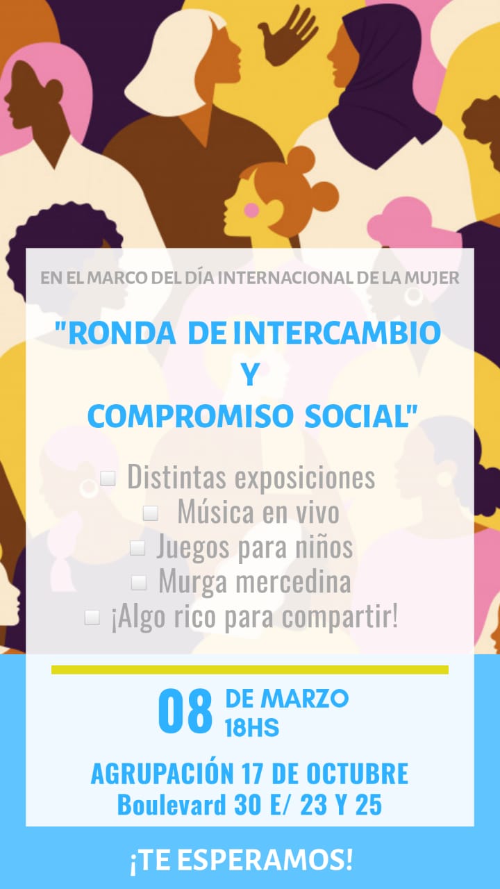 En el marco de las actividades que distintas organizaciones llevarán adelante por el Día de la Mujer, este domingo 8 de marzo, a partir de la hora 18, la Agrupación Justicialista ¡7 de Octubre, realizará una “Ronda de Intercambio y Compromiso Social” con mujeres brindando su experiencia de vida, además de música, juego y una murga como cierre del evento a realizarse en la sede y puerta de la agrupación política selvista en la calle 30, entre 23 y 25.