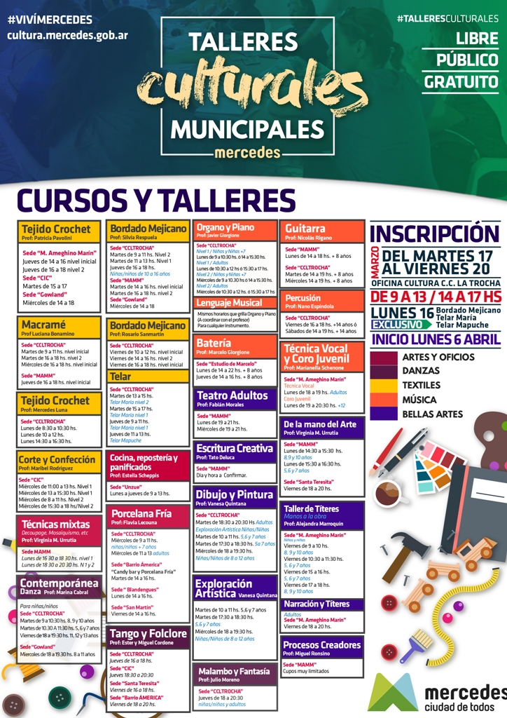 A partir del lunes 16 y hasta el viernes 20 se llevarán a cabo las inscripciones para los Talleres Culturales. La Dirección de Cultura adelantó la oferta de este año incluye artes y oficios; danzas; textiles; música y bellas artes. Los horarios son de 9 a 13 horas y de 14 a 18 horas.