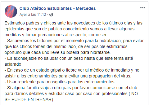 En cuanto a otros clubes, a través de sus redes sociales no manifestaron suspensión de actividades, pero en casos como Estudiantes y Unión, brindaron normas preventivas para que todos los que ingreses a sus predios tengan en cuenta y poder evitar una posible propagación del virus. En cuanto a Club Mercedes, tenía su «Matineé Blanquinegra» organizada para recaudar fondos y fue suspendida.