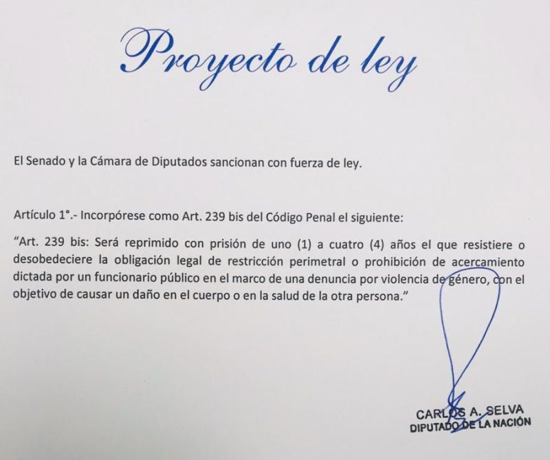 En el proyecto de Ley, Selva pretende que se incorpore como Artículo 239 bis del Código Penal lo siguiente: “Art. 239 bis: Será reprimido con prisión de uno (1) a cuatro (4) años el que resistiere o desobedeciere la obligación legal de restricción perimetral o prohibición de acercamiento dictada por un funcionario público en el marco de una denuncia por violencia de género, con el objetivo de causar un daño en el cuerpo o en la salud de la otra persona.”