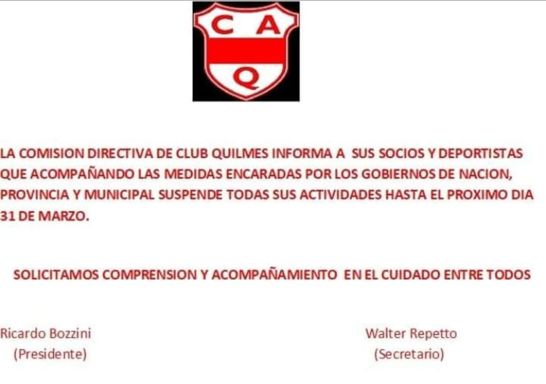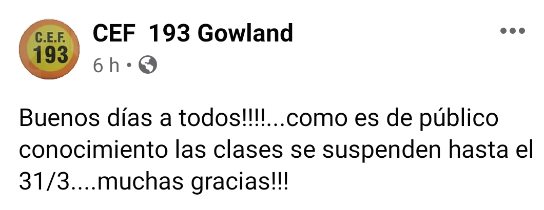 En este sentido, el CEF 40, el CEF 193 de Gowland, Los Carteros, Palometas, Juventud y Costa Brava de Suipacha, Palometas, Vélez, Trocha, Defensores Juniors, Unión, El Timón, Ateneo, Quilmes, Mercedes, El Frontón, Cumelén, Escuela de Futsal Municipal, entre otros, difundieron a traves de sus redes sociales y de las particularidades de cada disciplina que tienen, el cese de todo tipo de actividades.