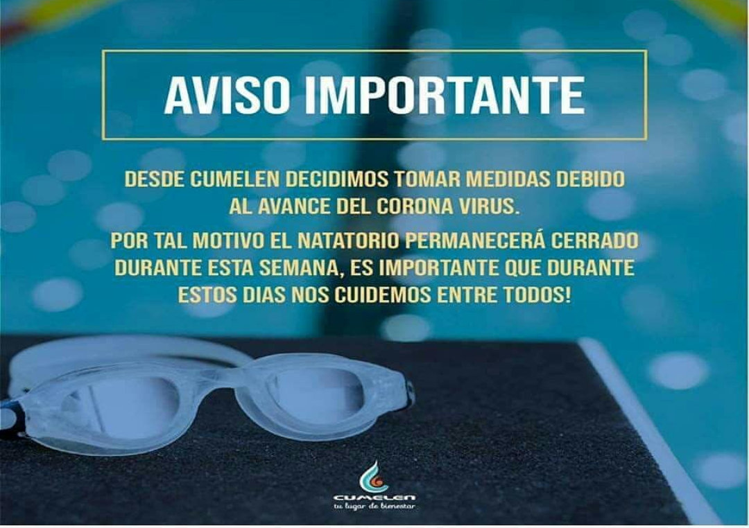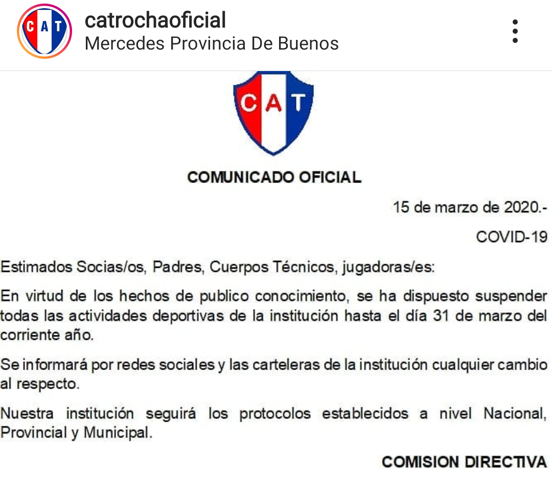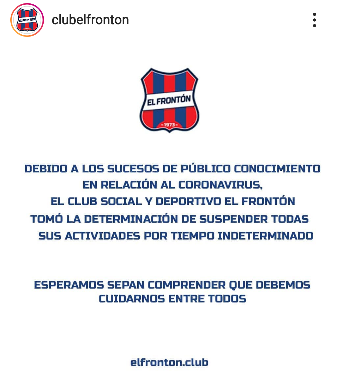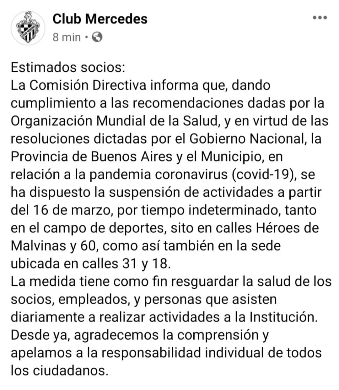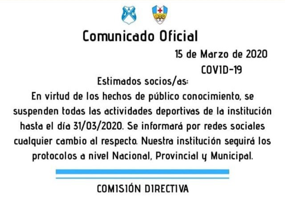 A través de las redes sociales, las diferentes instituciones deportivas de la ciudad anunciaron que no tendrán actividades como mínimo hasta el 31 de marzo próximo, como medida preventiva para evitar el contagio de Coronavirus, la influenza que viene hostigando a todo el planeta. Esta determinación ocurrió en la mayoría de los clubes luego de la conferencia de prensa que el domingo por la noche brindó el presidente Alberto Fernández.