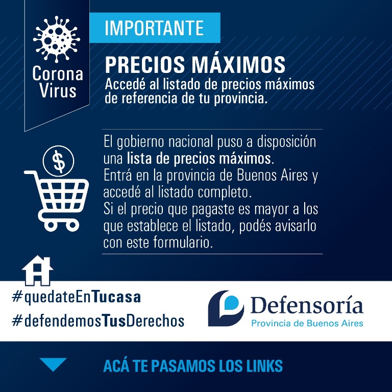 Por su parte, y como complemento el control de precios oficial, el Defensor del Pueblo Bonaerense facilitó los links para que los vecinos sean quienes verifiquen los precios máximos establecidos por el gobierno nacional.
