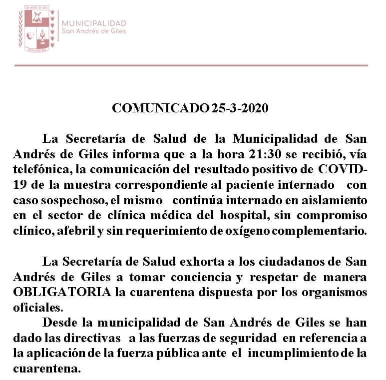 La Secretaría de Salud de San Andrés de Giles confirmó un segundo positivo por COVID-19. Se trata del paciente que se encuentra internado en el hospital municipal de la localidad vecina. El gilense no tiene compromiso clínico, afril y no requiere de oxigeno complementario. Continúa en aislamiento. El paciente es el marido de la señora que falleció en la mañana del sábado que se encontraba internada en Luján.