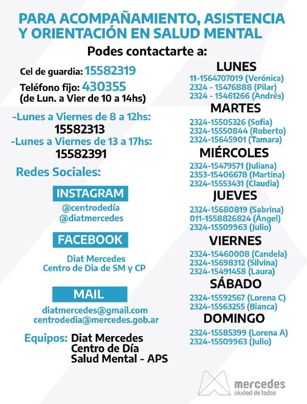 Por Prensa Municipal – Ante esta situación compleja que irrumpió de manera vertiginosa en nuestra ciudad y el mundo, los diferentes mecanismos municipales debieron adaptarse para brindar control, ordenamiento y ayuda a los vecinos de la ciudad. Es así como el Centro de Día de Salud Mental y Consumo Problemático Municipal y sus diferentes dispositivos de ayuda, el DIAT mercedes y el área de Salud Mental del APS instrumentaron múltiples canales de comunicación para brindar apoyo a quienes lo necesiten.