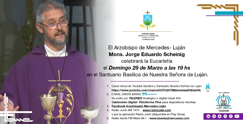 El Arzobispo de Mercedes-Luján Mons. Jorge Eduardo Scheinig, ofrecerá este domingo 29 de marzo una misa en la Basílica de Luján que podrá seguirse a través del canal Santa María, de radio AM y FM y del canal de youtube del Arzobispado. A partir de la hora 19, los feligreses podrán seguir la celebración religiosa a través de los medios dispuestos por el Arzobispado.