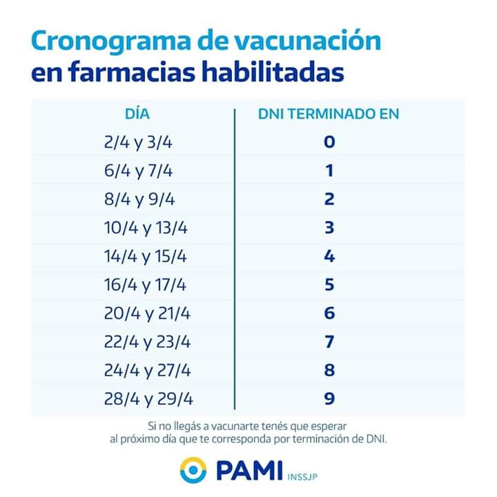 Se recomienda llamar antes de ir a la farmacia para solicitar el turno el día que le corresponde. Ya que el dispositivo de vacunación está organizado según la terminación del número de DNI de las personas afiliadas: En caso de que no pueda concurrir el día que le corresponde por la terminación del número de DNI, deberá esperar a que termine el cronograma y vuelva a empezar la ronda de turnos.