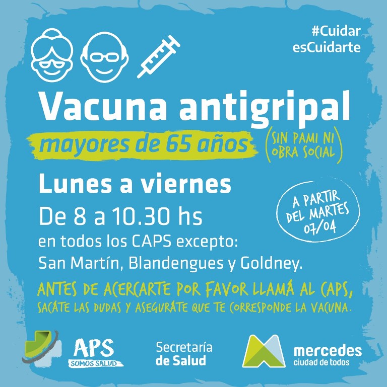 El Municipio de Mercedes comenzó el diagrama de vacunación antigripal como así también contra la neumonía para personas dentro del grupo con factores de riesgo y mayores de 65 años. La misma se ofrecerá a través del dispositivo de salud implementado en el CIC y los diferentes CAPS de nuestra ciudad, excepto Blandengues, San Martín y Godney.