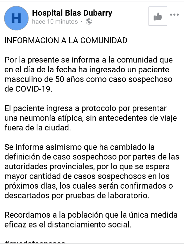 «Se informa asimismo que ha cambiado la definición de caso sospechoso por partes de las autoridades provinciales, por lo que se espera mayor cantidad de casos sospechosos en los próximos días, los cuales serán confirmados o descartados por pruebas de laboratorio. Recordamos a la población que la única medida eficaz es el distanciamiento social» resaltan desde el Hospital Blas L. Dubarry.