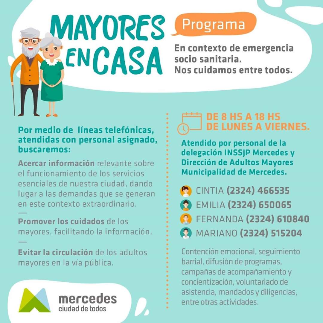 A través de una conferencia de prensa llevada adelante en la mañana de este viernes, el Municipio de Mercedes con la Dirección de Adultos Mayores, PAMI, ANSES y representantes de la Iglesia Católica, anunciaron un programa de asistencias a los Adultos Mayores para que no salgan de sus casas en el contexto de emergencia socio sanitaria.