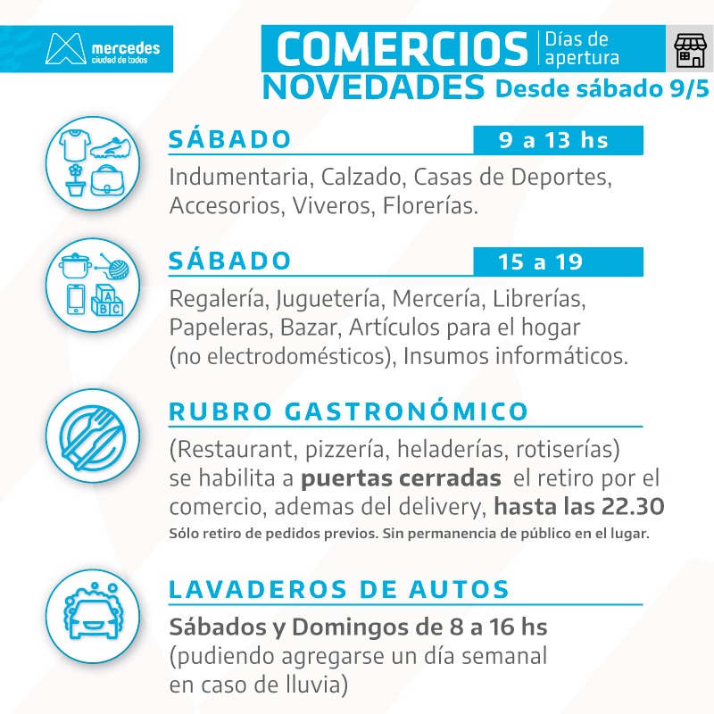 En el marco de una «cuarentena controlada», el Municipio de Mercedes confirmó que los sábados podrán abrir los comercios en en horario especial. En tanto, se permite que el rubro gastronómico podrá vender «para llevar» además del delivery y los lavaderos de autos tendrán permitido trabajar los sábados y domingo.