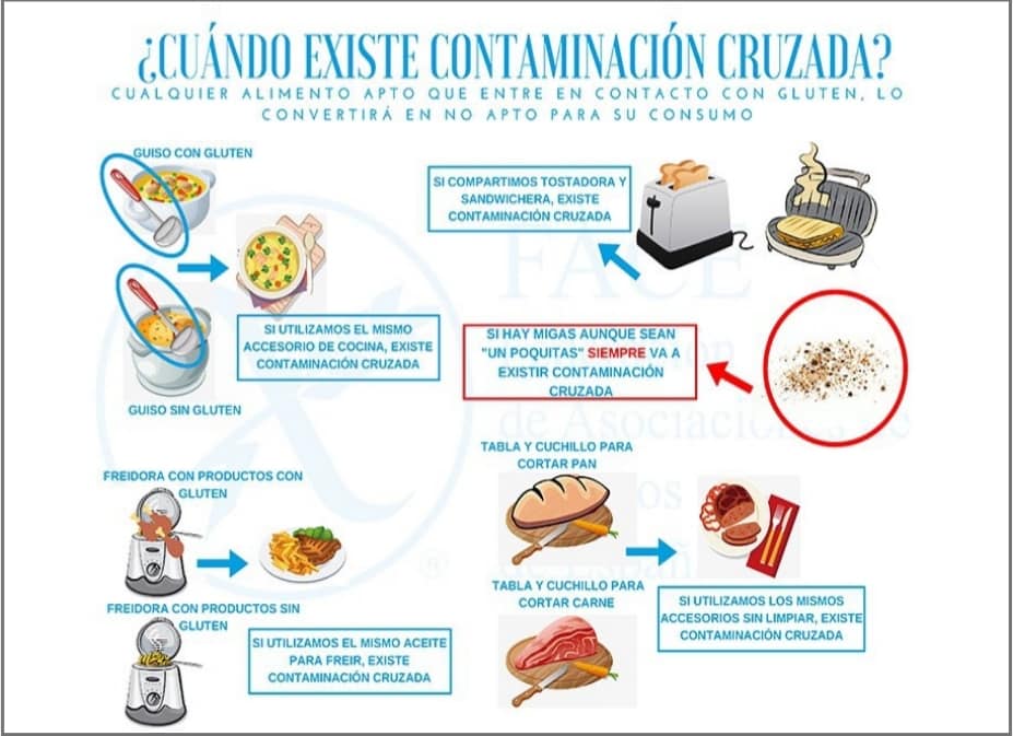 La contaminación cruzada es la que se produce al manipular los productos durante su preparación. Se da cuando un alimento limpio entra en contacto directo con un alimento contaminado. Por ejemplo, poner verduras en el mismo recipiente donde se pone carne cruda o un alimento con gluten a uno sin TACC.