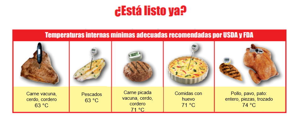 Para garantizarnos que un alimento sea seguro para nuestra salud, debemos cocinarlo de forma tal que alcance la temperatura mínima interna la cual destruye los microorganismos. Estas temperaturas se deben alcanzar y mantener durante un tiempo específico y debe ser medida con un termómetro correctamente calibrado en la parte más gruesa del alimento, o bien, mediante los indicadores de temperatura de su cocina.