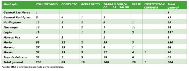 Asimismo, se conoció el informe de la Región Sanitaria VII. En éste puede verse la información provista por la provincia hasta la tarde del domingo de la cantidad de casos positivos de las localidades Luján, Merlo, Moreno, General Rodríguez, General Las Heras, Hurlingham, Ituzaingó, Marcos Paz, Morón, y Tres de Febrero.