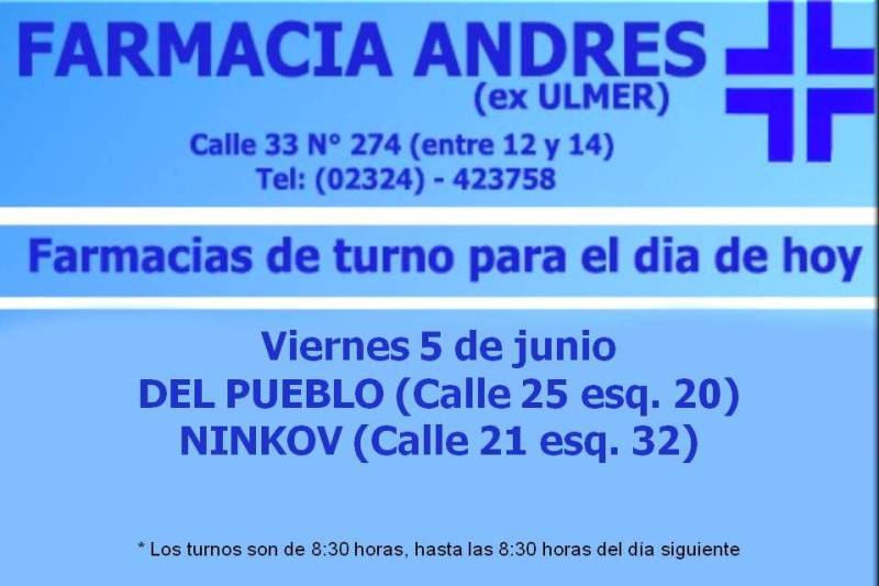 Farmacias de turno día viernes 5 de junio 5 junio, 20205 junio, 2020Desde la hora 8:30 del día de hoy hasta la misma hora de mañana, las farmacias de turno son: Del Pueblo y Ninkov.Comparte esto: Haz clic para compartir en WhatsApp (Se abre en una ventana nueva) WhatsApp Haz clic para compartir en Telegram (Se abre en una ventana nueva) Telegram Haz clic para compartir en X (Se abre en una ventana nueva) X Haz clic para compartir en Facebook (Se abre en una ventana nueva) Facebook TE PUEDE INTERESARCOMENTARIOS Comentarios