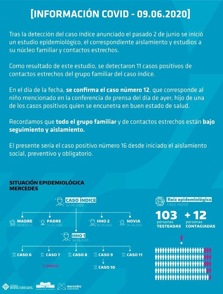 A través de una comunicación publicada en redes sociales, el Municipio de Mercedes confirmó el positivo número 12 derivado del caso índice, el trabajador de Agrale. Se trata de un nene de 6 años que durante el anuncio del día lunes se anticipó que le harían los estudios correspondiente, ya que es hijo de uno de los casos positivos anunciados y confirmados en la exposición del Intendente Ustarroz y el médicos Pablo Cassiani.