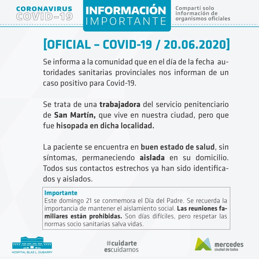 Asimismo, el Municipio de Mercedes destacó como importante que este domingo 21 se conmemora el Día del Padre. Por lo tanto, «recuerda la importancia de mantener el aislamiento social. Las reuniones familiares están prohibidas. Son días difíciles, pero respetar las normas socio sanitarias salva vidas».
