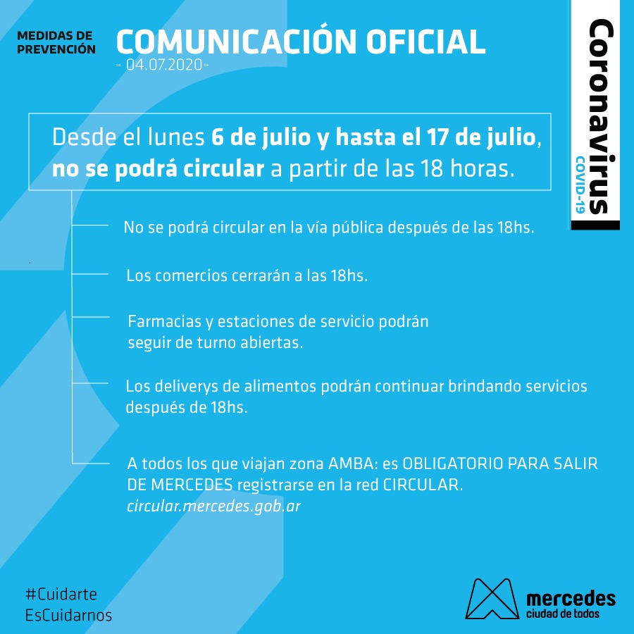 Para concluir, el Intendente Municipal anunció el decreto que comenzará a regir a partir del lunes. “Creemos que es necesario tomar medidas fuertes para evitar la circulación en nuestra ciudad. Por eso decretamos que desde el lunes 6 de julio y hasta el 17 de julio no se podrá circular a partir de las 18 horas y los comercios deberán cerrar, exceptuándose farmacias y estaciones de servicios que permanecerán abiertas en sus horarios habituales. Los rubros alimenticios solo podrán realizar envíos a domicilio a partir de ese horario”, resaltó Ustarroz. (NdR: Esto significa que los comercios esenciales deberán cerrar sus puertas a esa hora, mientras que los no esenciales mantendrán los días y horarios de apertura tal lo pautado y el próximo sábado cerrarán también a la hora 18).