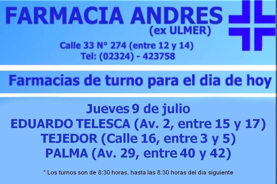Farmacias de turno día jueves 9 de julio 9 julio, 2020Desde la hora 8:30 de hoy hasta la misma hora de mañana, las farmacias de turno son: Eduardo Telesca, Tejedor y PalmaComparte esto: Haz clic para compartir en WhatsApp (Se abre en una ventana nueva) WhatsApp Haz clic para compartir en Telegram (Se abre en una ventana nueva) Telegram Haz clic para compartir en X (Se abre en una ventana nueva) X Haz clic para compartir en Facebook (Se abre en una ventana nueva) Facebook TE PUEDE INTERESARCOMENTARIOS Comentarios