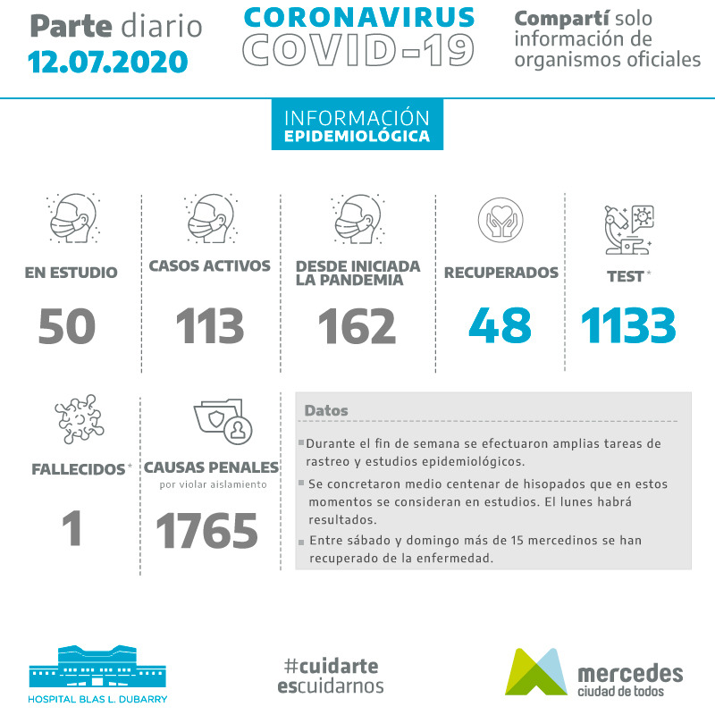 A lo largo del fin de semana, fueron hisopados varias personas con nexo epidemiológico de los pacientes que dieron positivos días previos. Cincuenta de ellos esperan los resultados que se conocerán este lunes. Asimismo, 15 de los pacientes que fueron confirmados días atrás, ya recibieron el alta al confirmarse que no tenían más el virus que produce covid-19.