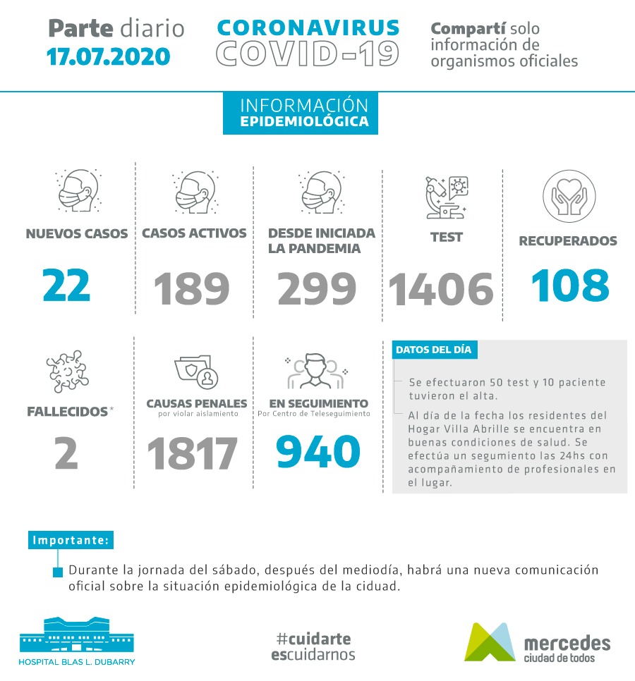 En el día de la fecha tras los estudios efectuados por el Laboratorio de Virología Molecular Municipal se detectaron 22 nuevos casos para covid-19 de los 50 test realizados en la ciudad de Mercedes. Se informó también que 10 pacientes lograron el alta médica tras recuperarse del virus. Son 108 los pacientes que tuvieron el alta. En tanto, son 189 casos activos y 299 personas que tienen y tuvieron el covid-19 desde iniciada la pandemia.