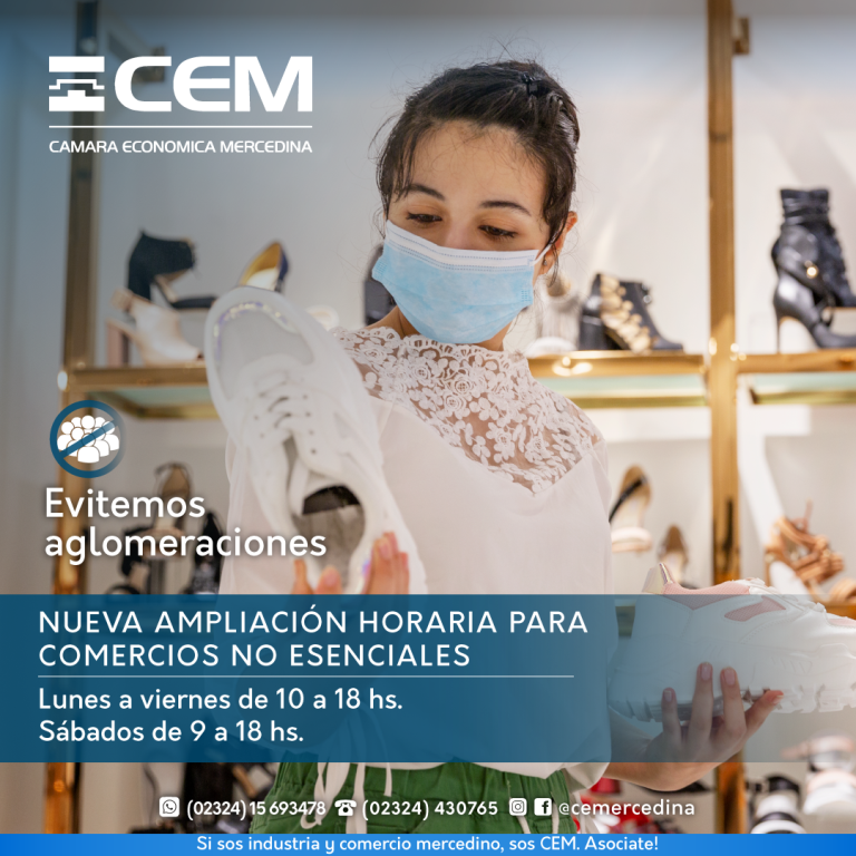 La Cámara Económica Mercedina, a través de su presidente Mario Dimaro, su vicepresidente Oscar Pontón y su gerente Ariel Pietrucha, presentó la propuesta del nuevo horario con la anuencia del Sindicato de Empleados de Comercio. Propuesta que fue aceptada por la Municipalidad y por el resto de las instituciones que integran el Comité de Crisis, a quienes la CEM agradece ya que esta ampliación en la atención del cliente evitará mucho más las aglomeraciones en los comercios y veredas donde se forman colas.