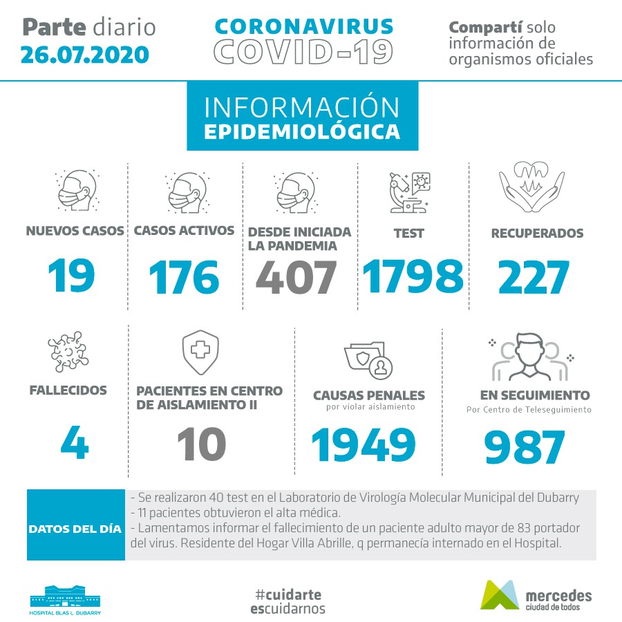 El informe emitido por el Hospital Blas L. Dubarry y el Municipio de Mercedes de este 26 de julio expresa:
